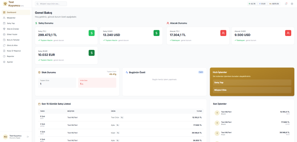 - Finansal Özet: Günlük toplam satışlarınızın (TL, USD, EUR, Has) ve bekleyen alacaklarınızın anlık özeti.