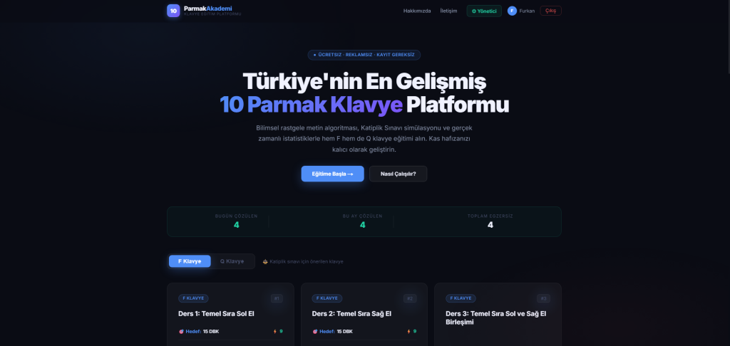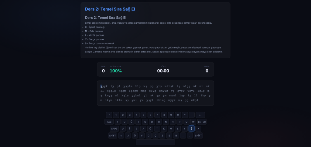 Sistemimiz, basit bir harf dizilimi oyunundan ibaret değildir. Kendi oluşturduğumuz algoritmik antrenman setleriyle, kullanıcının kas hafızasını (muscle memory) adım adım inşa ediyoruz. F ve Q klavye için özel olarak optimize edilmiş ders içerikleri ardışık bir öğrenme hiyerarşisi (kolaydan zora) sunarken, platformun sahip olduğu akıllı metin motoru (Typing Engine) saniyelik okuma ve yazma gecikmelerini hesaplayarak kullanıcının zayıf yönlerini raporlamaktadır. Öğrenci, gelişimini grafikler eşliğinde izlerken, bizler de eğitmen olarak arka planda nerede müdahale etmemiz gerektiğini net verilerle analiz edebiliyoruz.